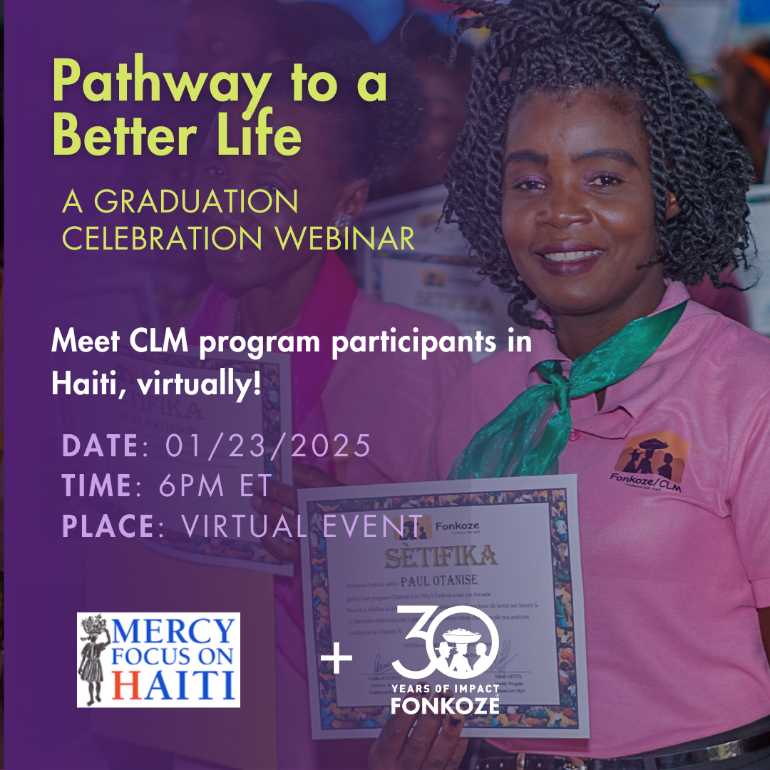 Virtual Partner Presentation: Fonkoze’s CLM program Featuring our partner: Mercy Focus on Haiti, a ministry of the Sisters of Mercy of the Americas Register here for the virtual event. Date: August 22 Time: 6pm ET Topic: Join Fonkoze staff in Haiti and partners from Mercy Focus on Haiti, a ministry of the Sisters of Mercy […] Read More